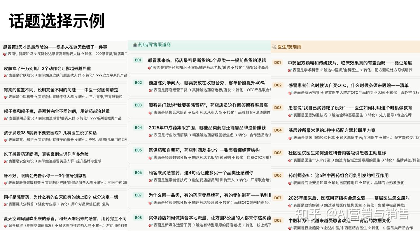 - 长尾话题优于热门话题:竞争少的细分话题更容易卡位------如"中老年慢病患者OTC自购行为分析"