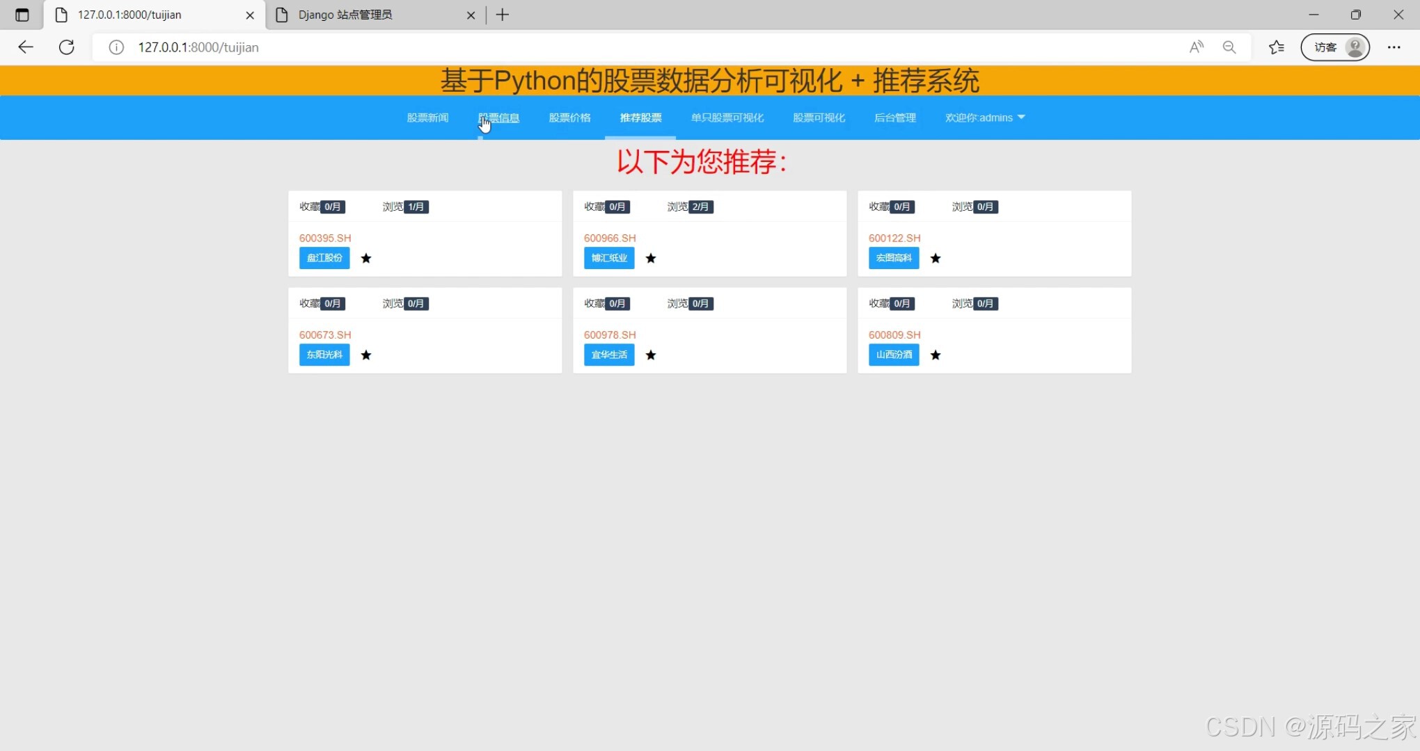 该页面是股票数据分析可视化系统的推荐模块,展示推荐股票列表,显示股票代码与名称,提供收藏和浏览记录信息,为用户提供个性化的股票推荐服务。