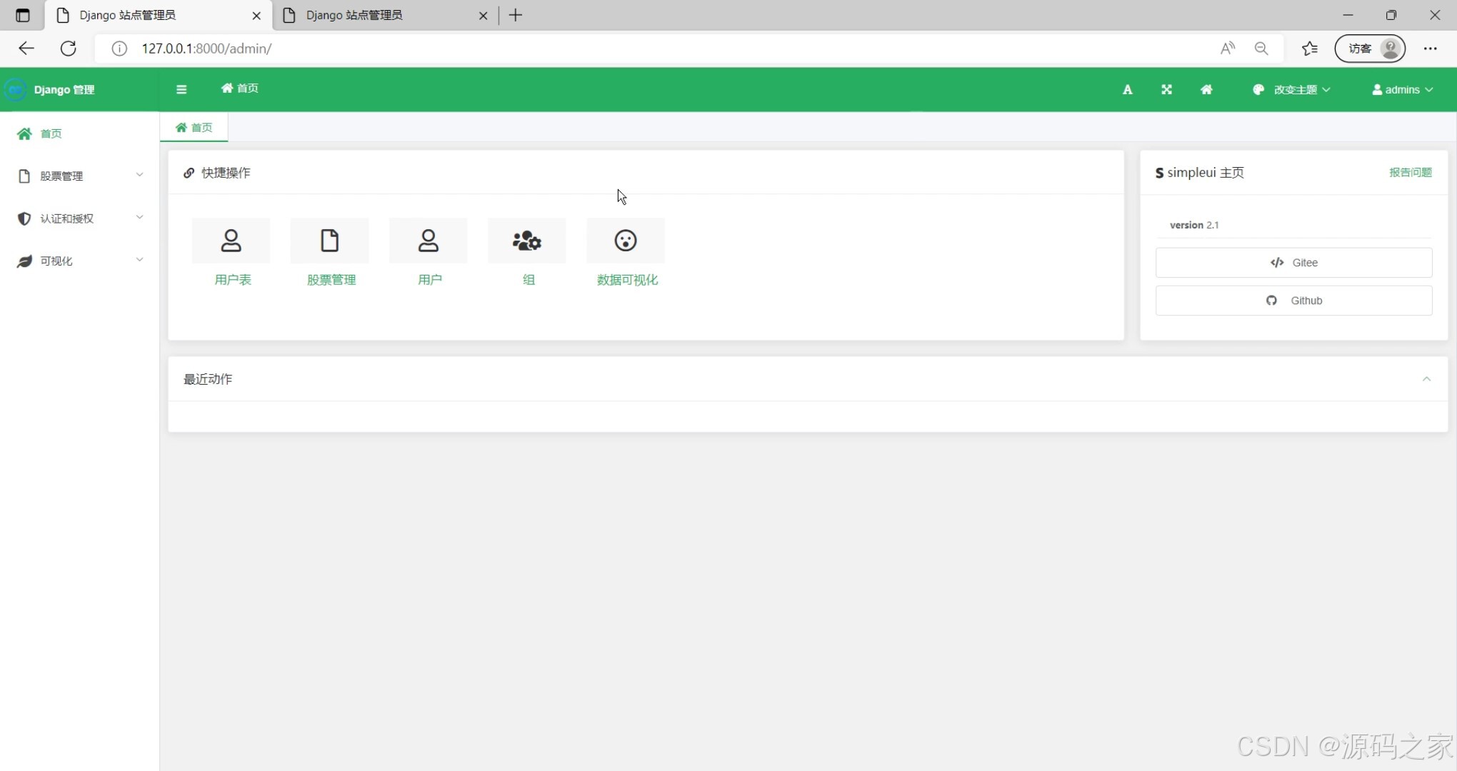 该页面是基于Django的后台管理系统,提供用户表、股票管理、数据可视化等快捷操作入口,支持对用户、股票数据及可视化模块进行管理,同时可查看最近操作记录,为管理员提供全系统数据维护功能。
