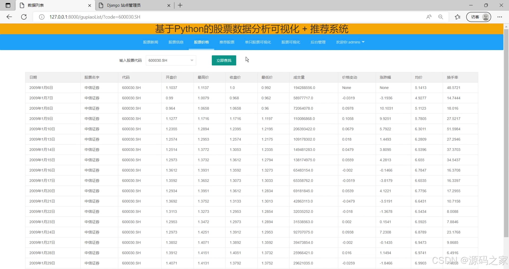 该系统基于Django框架构建,后端使用requests和BeautifulSoup爬取股票数据与新闻资讯,前端通过Echarts实现多样化图表展示。系统为用户提供注册登录、个人信息维护及股票收藏功能。在数据展示层面,支持所有股票的可视化对比与单个证券的饼图、折线图、柱状图、K线图等多维度分析。新闻模块实时展示市场资讯,帮助用户获取最新动态。推荐模块采用协同过滤算法,根据用户行为推荐个性化股票。后台管理功能支持数据爬取与算法配置,形成从数据采集、可视化分析到智能推荐的完整服务体系。