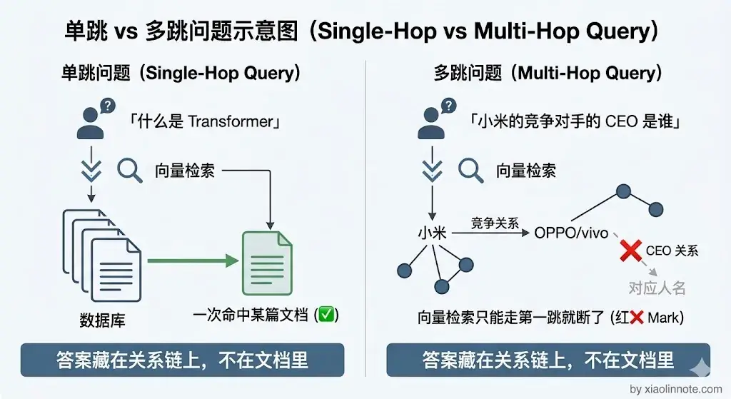 「小米的主要竞争对手的 CEO 是谁」,这个问题需要先找到「小米的竞争对手是谁」,再拿着这些名字去找「谁是他们的 CEO」,两步之间有实体跳转,向量检索每次只能走一步,第二跳就断了。