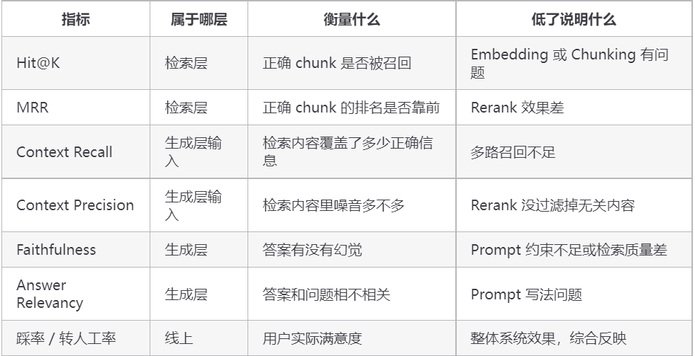 通过不同指标的组合,可以精确定位问题是出在检索层还是生成层,让优化有方向、有数据支撑,而不是凭感觉瞎调。