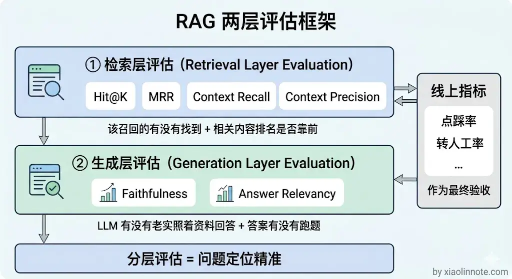 离线评估(Hit@K + RAGAs)用来快速迭代和定位问题,线上指标(踩率、转人工率)是最终验收标准。两者结合,形成「离线测评 -> 上线 -> 线上观测 -> 发现问题 -> 离线复现 -> 修复 -> 再上线」的完整评估闭环。