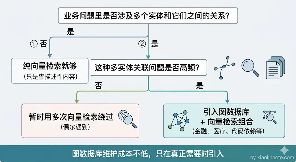 判断要不要用图数据库的简单原则:问题里是否同时出现多个具体实体名,并且在问这些实体之间「有什么关系」或「通过关系能找到什么」 。如果是,就值得考虑图增强;如果问题主要是找某段描述性的内容,向量检索就够了。