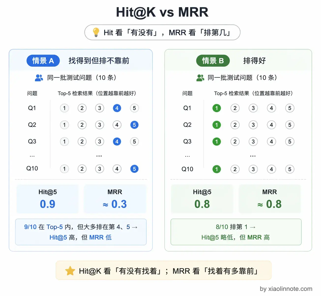 很多人容易混淆这两个指标,觉得差不多。简单来说:Hit@K 是「找到没」,MRR 是「多快找到的」 。Hit@5 等于 0.9,说明 90% 的问题都能在前 5 个结果里找到相关内容;但 MRR 只有 0.3,说明相关内容虽然找到了,但排得很靠后,可能第 4、第 5 才出现。配合起来用能精确定位检索层的问题出在哪一步。