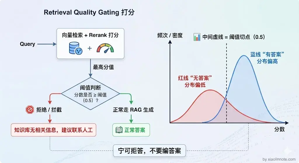 你可能会觉得,「拒答」这个行为会让系统显得很笨。但反过来想:用户问了一个知识库覆盖不到的问题,最好的答案就是「我不知道,请联系人工」,而不是 LLM 编一个听起来合理但实际错误的回答。答错比不答更危险。