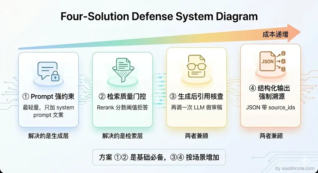 这两种幻觉的根源不同,解法也不一样。下面四个方案,是从「成本最低」到「机制最严格」依次递进的思路。
