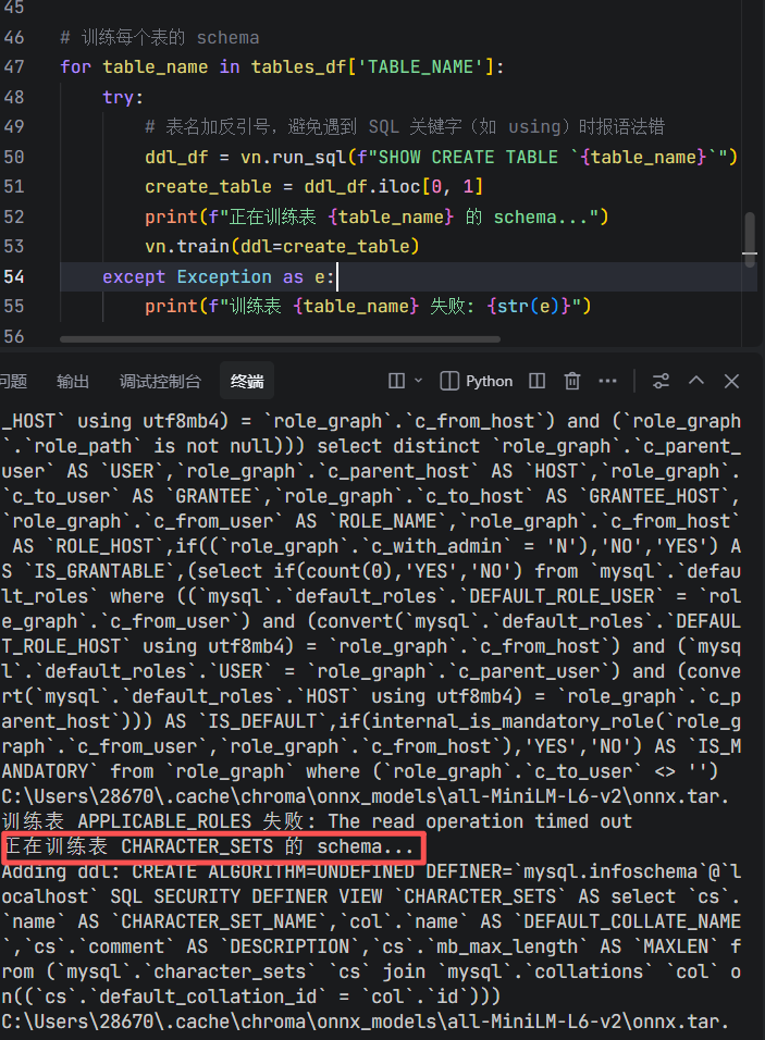 训练每个表的 schema,表名加反引号,避免遇到 SQL 关键字(如 using)时报语法错
