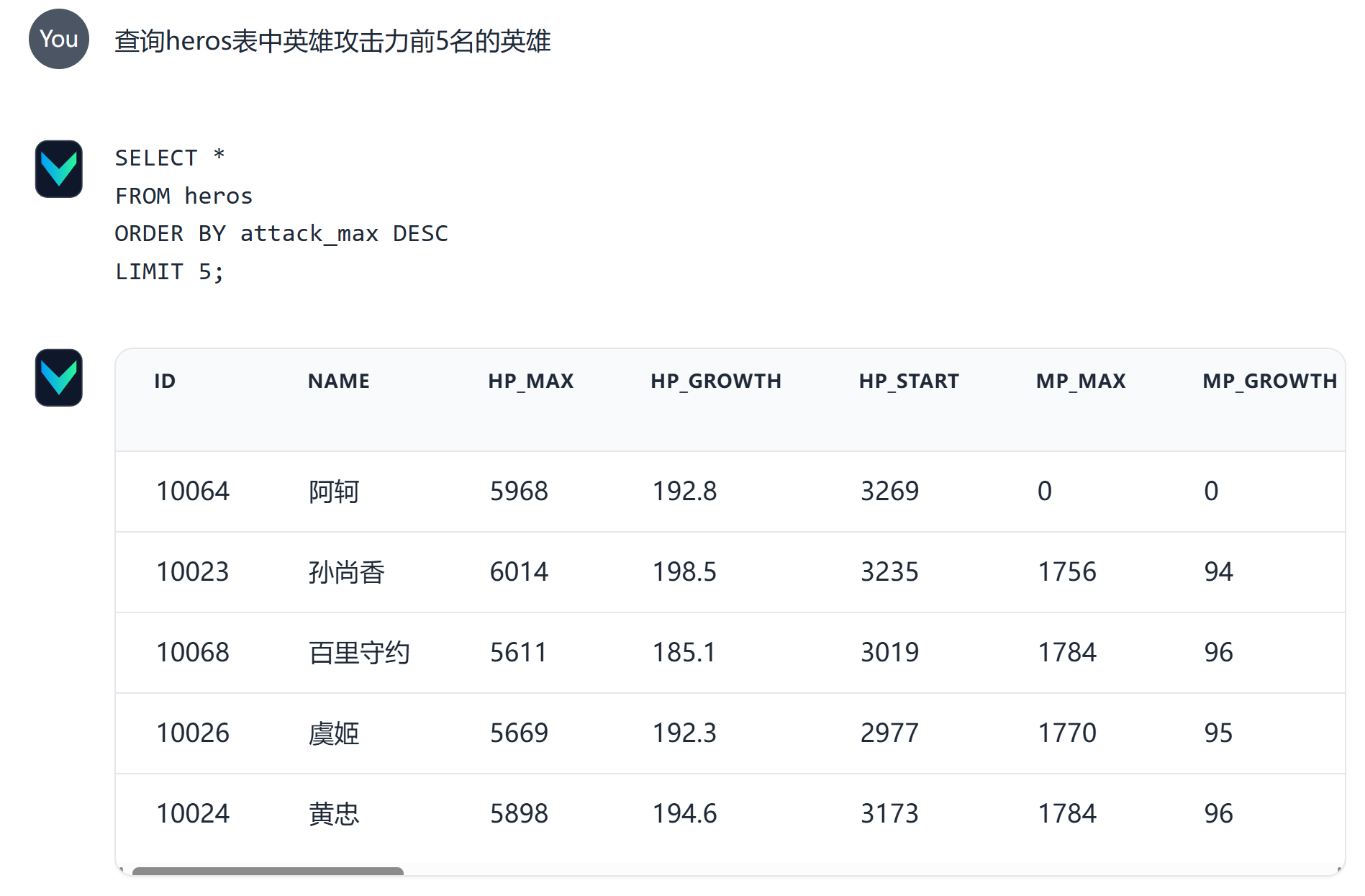 比如:vn.ask("查询heros表中 英雄攻击力前5名的英雄")
