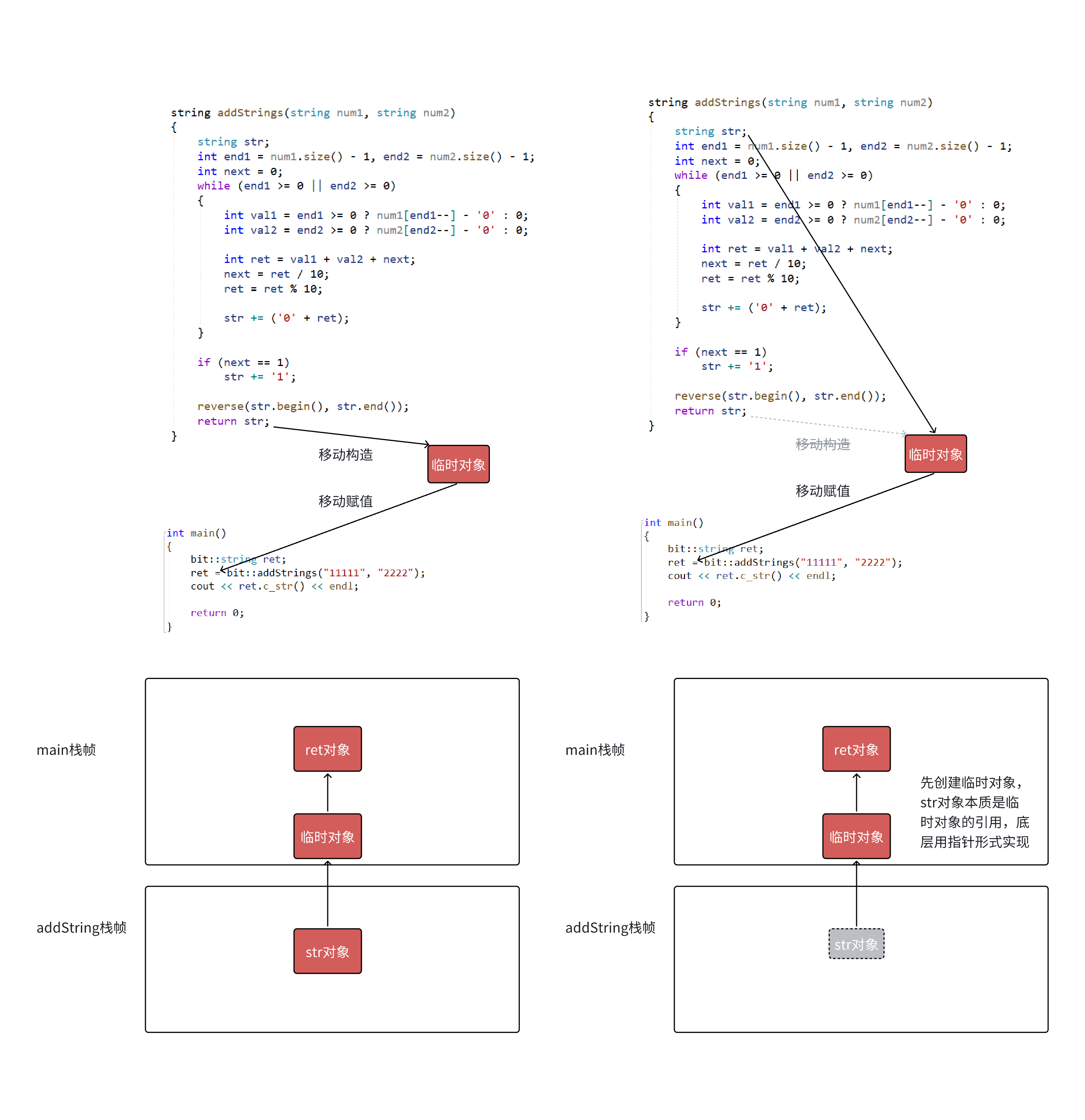 - 对于像string/vector这样的深拷贝的类或者包含深拷贝的成员变量 的类,移动构造和移动赋值才有意义,因为移动构造和移动赋值的第一个参数都是右值引用的类型 ,他的本质是要**"窃取"引用的右值对象的资源**(实际上就是指针的转移,数据还是存放在原来的位置(堆区)),而不是像拷贝构造和拷贝赋值那样去拷贝资源,从而提高效率。