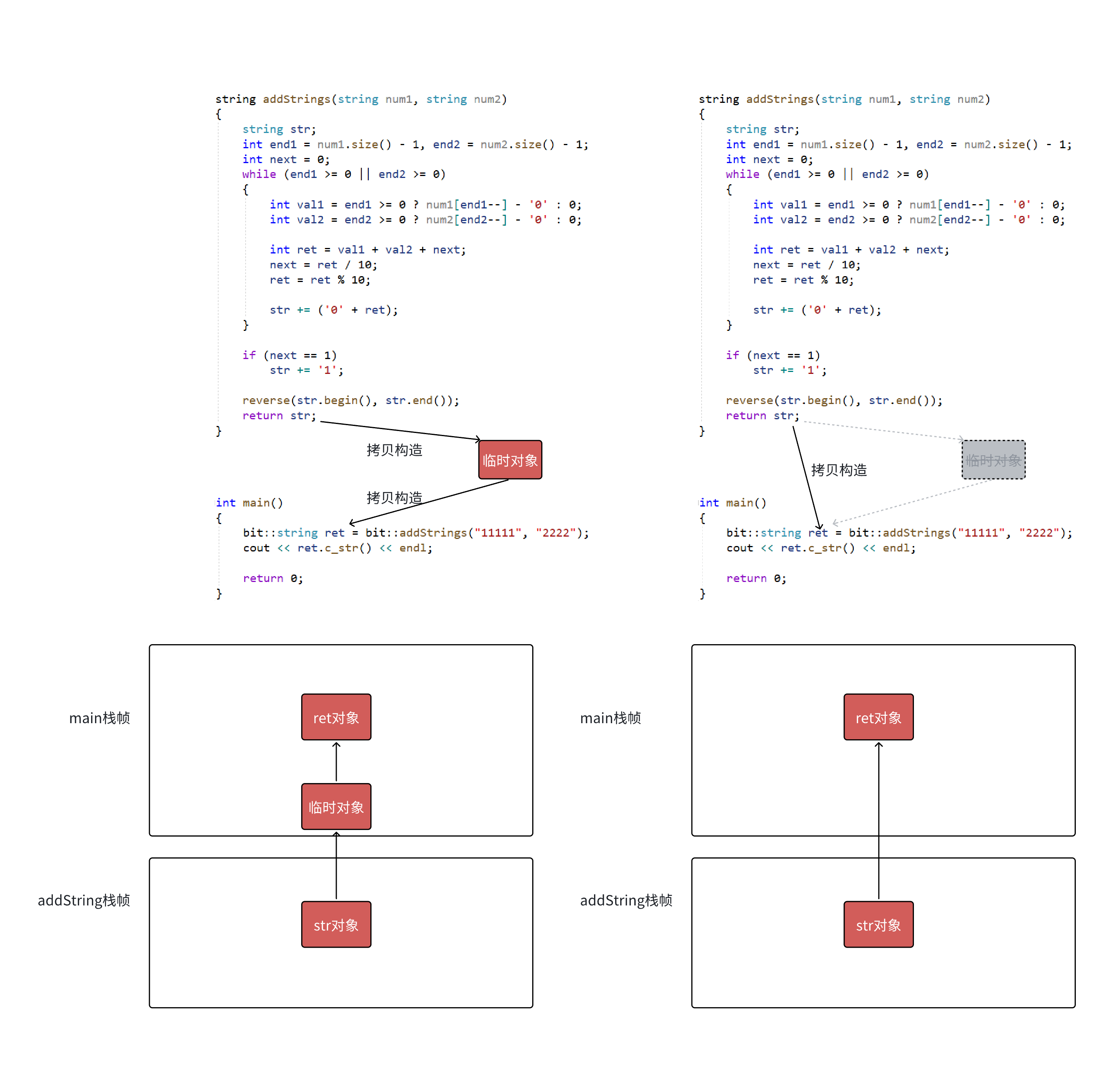 - 下图展示了vs2019 debug环境下编译器对拷贝的优化,左边为不优化的情况下,两次拷贝构造,右边为编译器优化的场景下连续步骤中的拷贝合二为一变为一次拷贝构造。