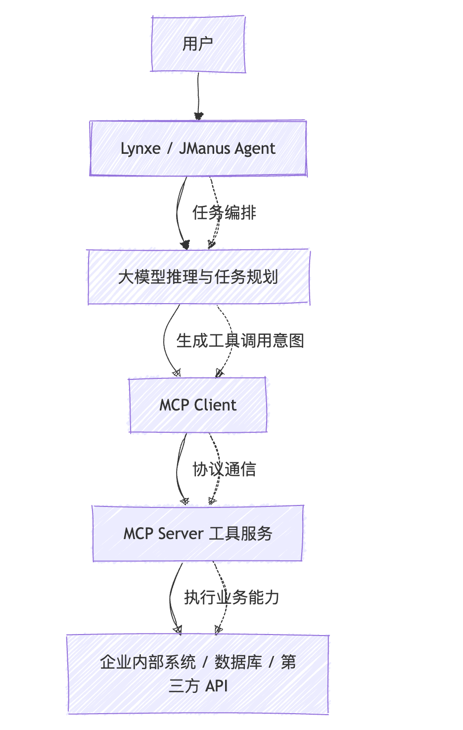 从定位上看,Lynxe 更像是一个 Java Agent 框架,而 MCP 则是工具协议层。两者结合后,可以形成比较完整的 AI 应用工程架构: