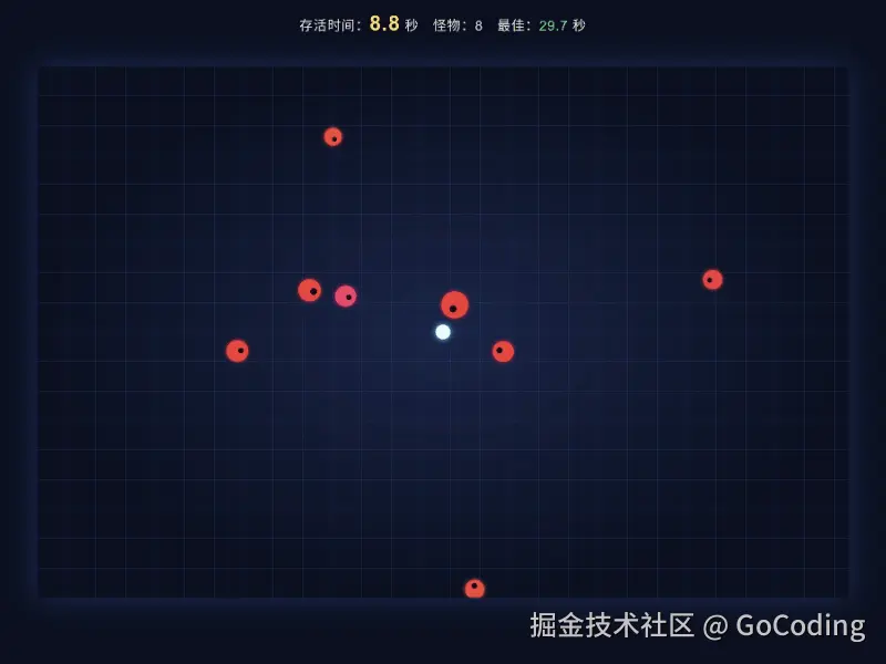 写一个 2D 躲怪物游戏,计时看谁坚持的久。用 HTML5,可直接玩。