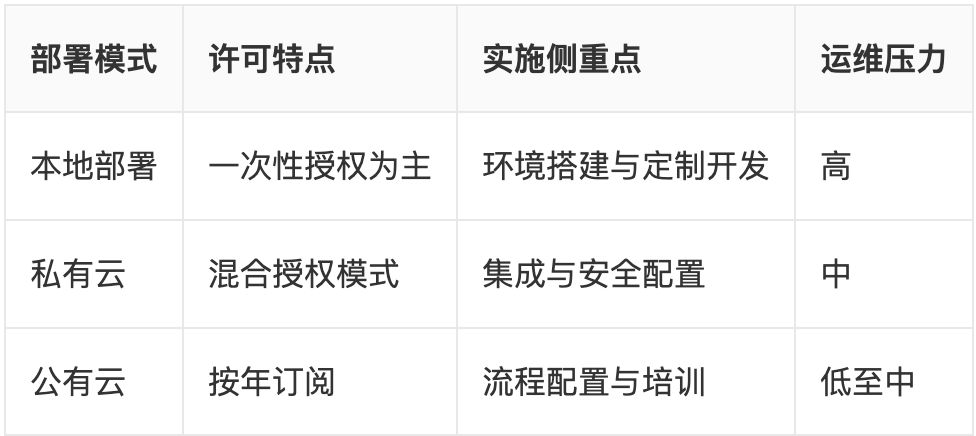 部署模式对预算拆分结构有着直接影响。**本地部署、私有云与公有云模式,在许可、实施与运维成本上的侧重点明显不同。**通过对比,可以帮助企业在选型时更理性地判断哪种模式更符合自身资源条件。