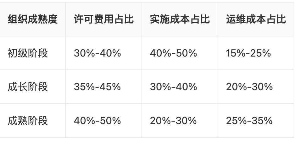 **需要强调的是,这些比例并非固定标准,而是用于校验预算是否明显失衡。**如果某一项目中实施成本接近零,或运维预算几乎未被考虑,往往意味着后期存在较大风险。