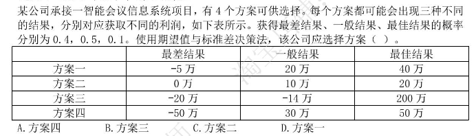 再计算各个方案的标准差:方案一:{(-5-12)² *0.4+(20-12)² *0.5+(40-12)² *0.1}的开方约=15.03,其它同理;最后求出各个方案的期望值与标准差的差值,哪个差值最大,方案就是最优的。