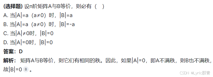 常见于选择题,针对抽象矩阵,核心是围绕它们的运算关系、等价、相似、合同这四大类,并常与秩、线性方程组、特征值等其他知识点进行综合考查。截图两个例子: