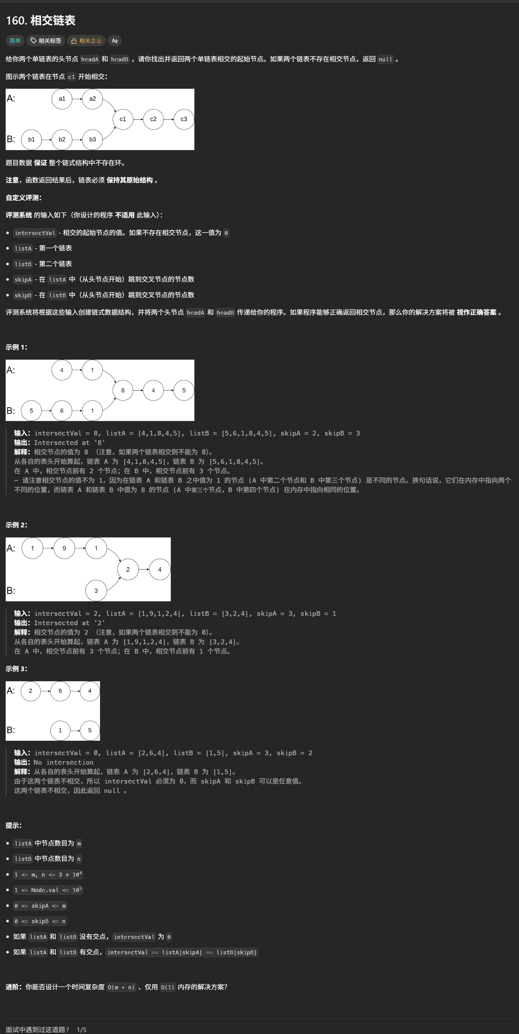 ListNode *pA = headA,*pB = headB;//两个指针分别从各自的头结点开始