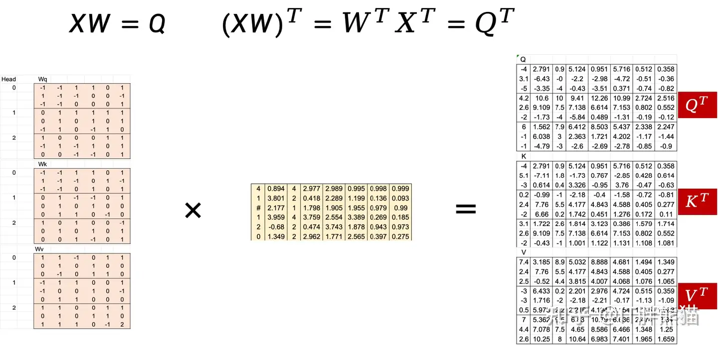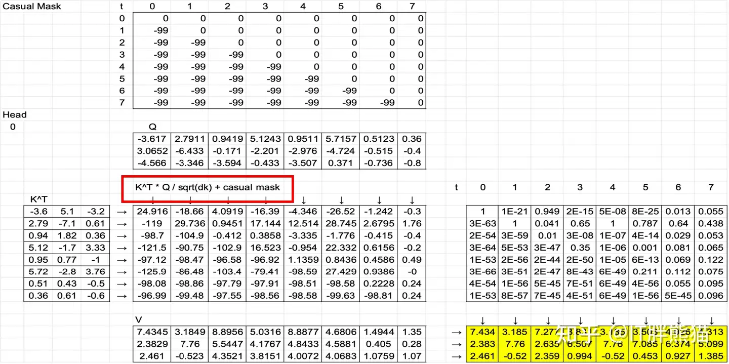 看下实际计算,依然是以Head 0为例,注意Casual Mask也做了转置。需要注意的是这里使用了3个注意力头,后面还会切换成2个注意力头,非常灵活。