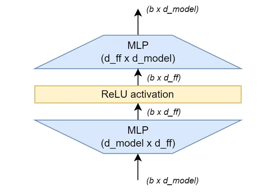 在最初的Transformer论文中,Transformer的前馈网络由两个带有Relu激活函数(ReLU(x)=max(0,x))介入其间的线性变换组成。内部前馈层的维度通常是输入维度的4倍。