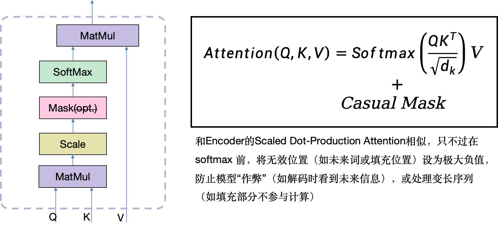 得到了Q、K、V之后,进行Masked MHA计算,数学上只要做个矩阵加法,即增加一个极大负值(这里需要注意转置的问题)