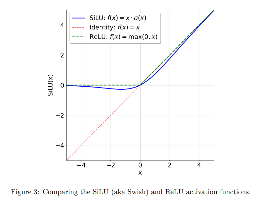 SiLU(x)=x.δ(x)=x1+e−xSiLU(x) = x.\delta(x) = \frac{x}{1+e^{-x}}SiLU(x)=x.δ(x)=1+e−xx