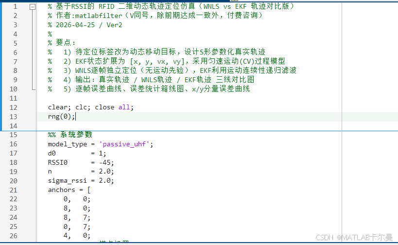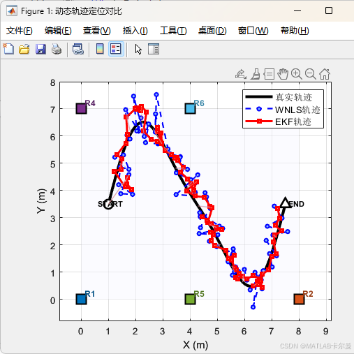 本文所述的仿真程序实现: RFID室内动态目标定位系统 ,通过对比加权非线性最小二乘法(WNLS)与扩展卡尔曼滤波(EKF)两种算法,评估其在动态场景下的定位精度与轨迹跟踪能力。