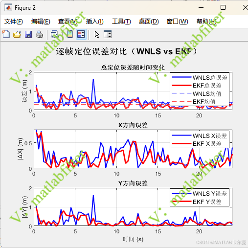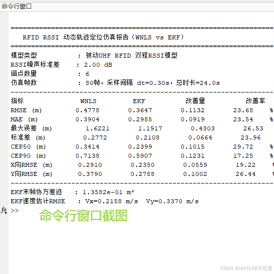命令行汇总了 RMSE、MAE、最大误差、标准差、CEP50/CEP90、X/Y向分量误差以及EKF速度估计误差等核心指标,并自动计算EKF相对WNLS的改善率