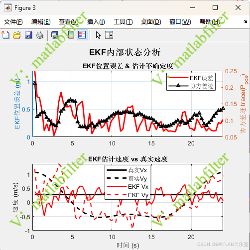 - EKF内部状态分析 --- 位置误差与估计协方差迹的双轴图、估计速度与真实速度的对比
