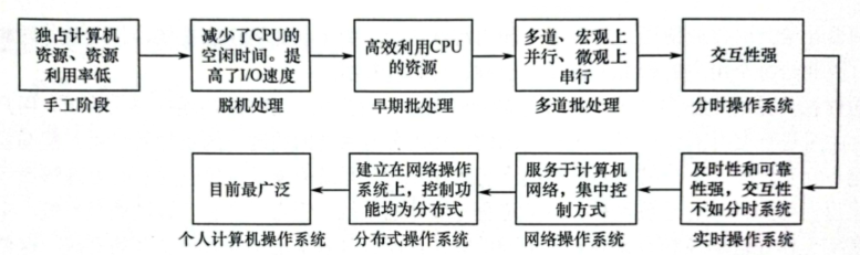 手工阶段,计算机造价昂贵,但工作时却有大量时间处于空闲状态,为了解决这个问题人类发明了单道批处理系统。单道批处理系统虽然较手工阶段资源利用率有所提升,但仍有大量空闲时间等待I/O操作完成,资源利用率仍然很低。为了进一步提高资源利用率,人类发明了多道批处理系统。这个阶段操作系统正式诞生,但在这阶段,用户无法进行程序调试,所以为了实现人机交互,人类发明了分时操作系统。分时操作系统给每个用户分配相同的时间段,导致不能优先处理一些紧急任务,为了解决这个问题,于是发明了实时操作系统。