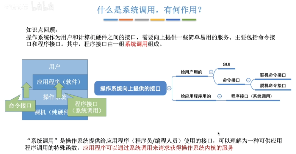 (2)程序接口(编程人员可以使用它们来请求操作系统服务):程序接口由一组系统调用(也称广义指令。系统调用类似于函数调用,是应用程序请求操作系统服务的唯一方式。)组成。用户通过在程序中使用这些系统调用来请求操作系统为其提供服务。(普通用户不能直接使用,只能通过程序代码间接使用。)当前最流行的是图形用户界面(GUI),即图形接口。