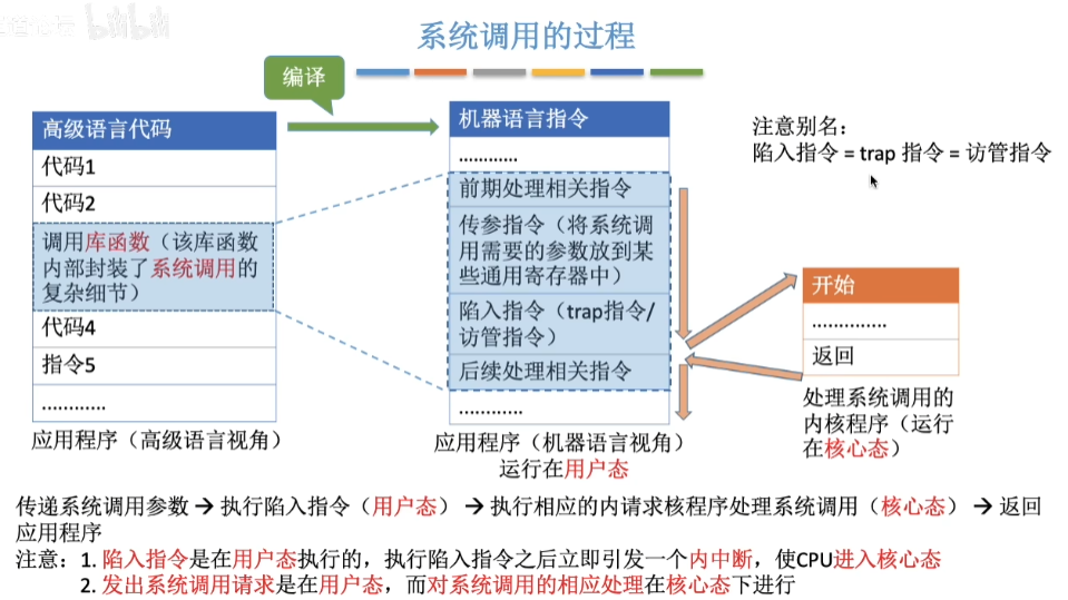 - 发出系统调用请求是在用户态,而对系统调用的相应处理在核心态下进行。
