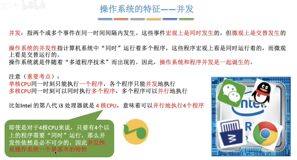 - 同时性。多个用户可以同时使用一台计算机。