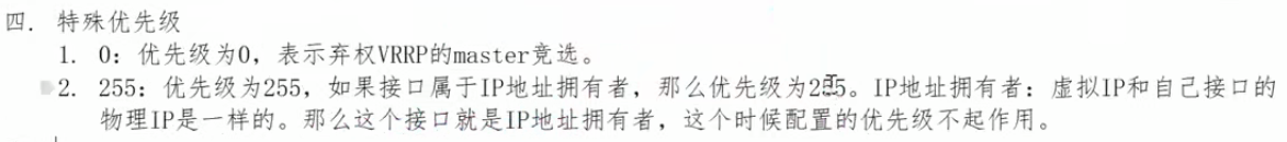 当一台路由器配置了虚拟 IP 与物理接口 IP 相同时(即"IP 拥有者"),其优先级自动为 255,永远成为 Master,不可被抢占(除非故障)。