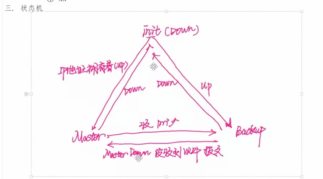 Backup:备胎,时刻监听 Master 的心跳(VRRP 通告),一旦 Master 挂了,Backup 接替成为新 Master。