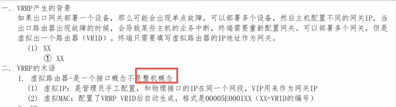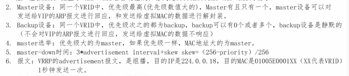 | VRRP 协议报文 | Master 和 Backup 之间发送的 VRRP 通告(组播 224.0.0.18),源 MAC 是真实 MAC,而不是虚拟 MAC。这样交换机才能区分不同物理设备。 |