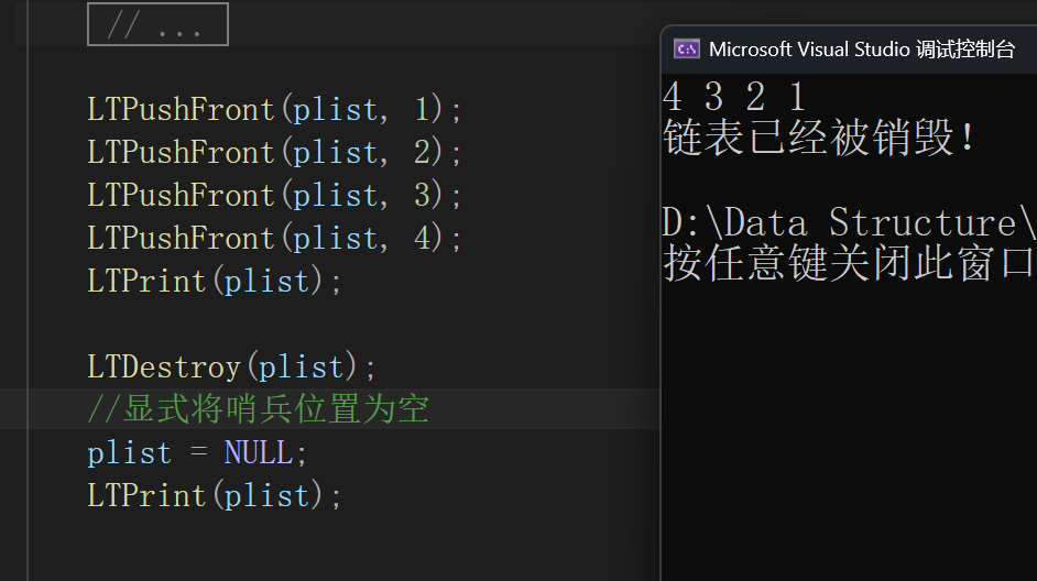 如果想打印销毁后的链表的话,我们直接在打印函数中对phead进行处理;