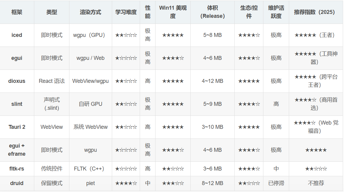 egui,一个轻量级 GUI 库,专为快速原型设计与小型应用开发打造。它具备简洁 API 和高效渲染速度,但可能在高级功能与组件方面有所欠缺