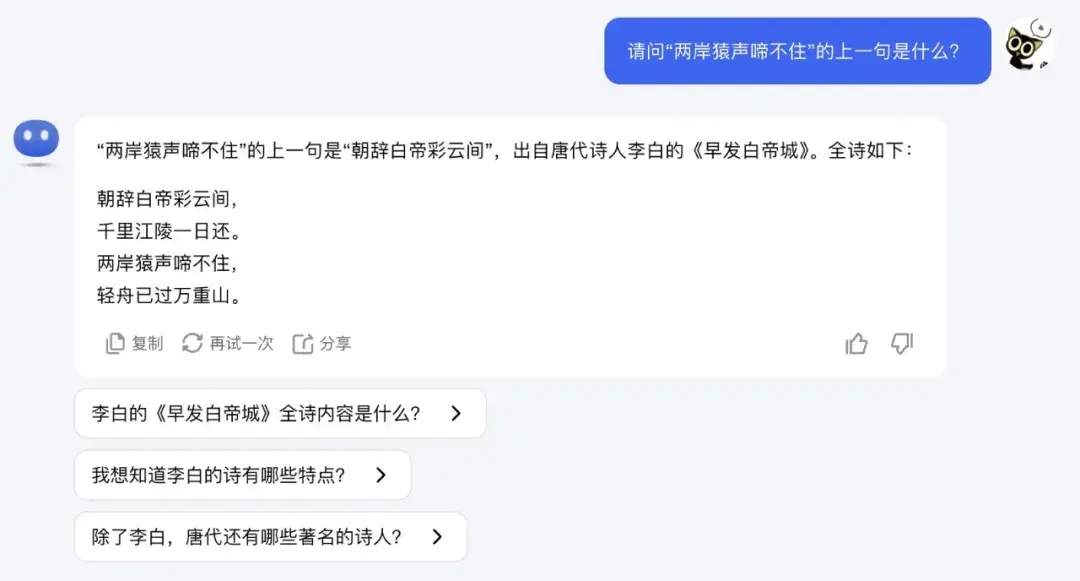 我们将某句唐诗输入给大语言模型,然后让它回答出下一句是什么。
