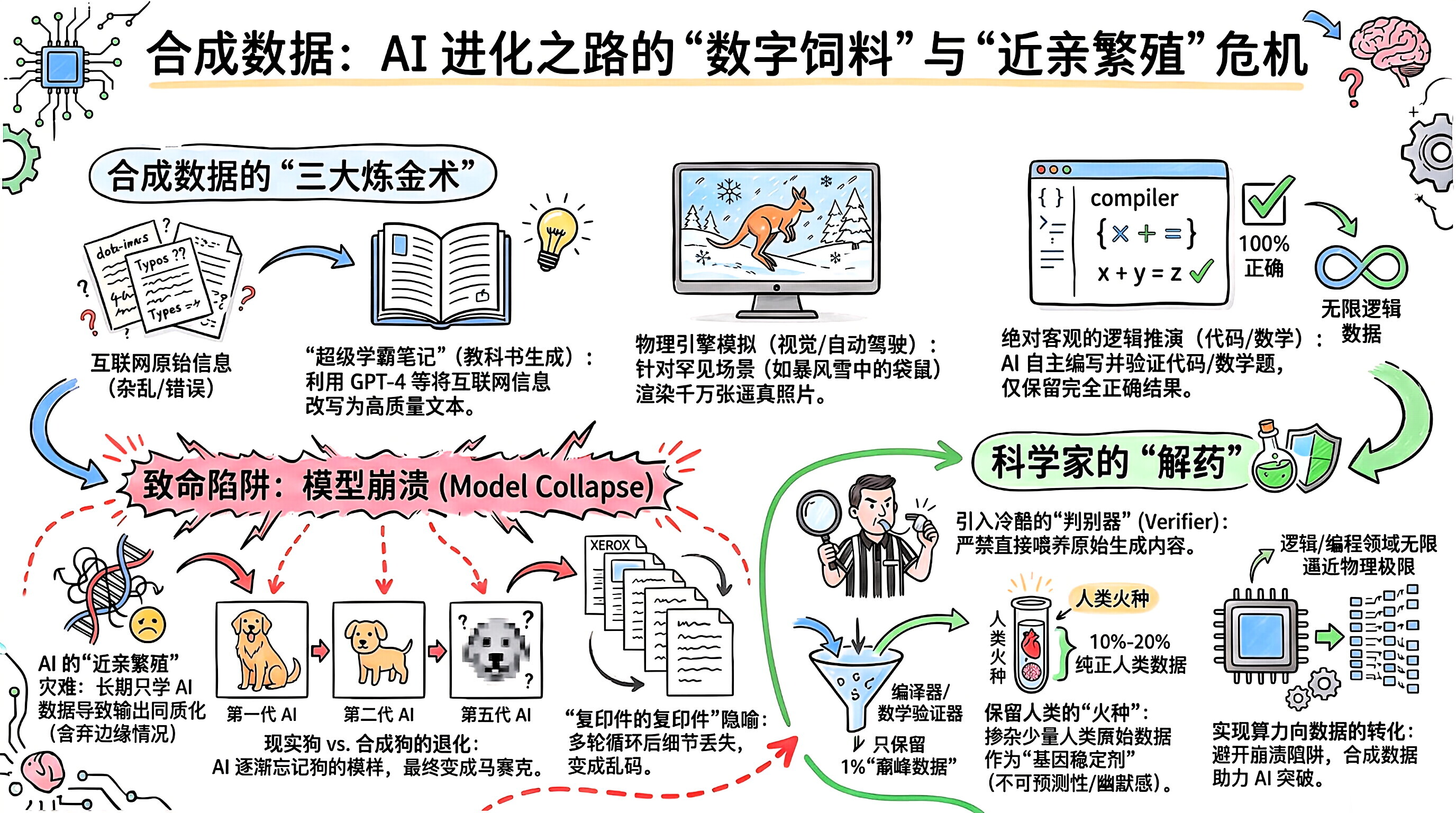 如果说过去十几年,训练 AI 用的是从互联网大自然里"野生采摘"的数据(人类写的文章、拍的照片); 那么现在,为了应对我们上一条聊过的"数据墙危机",科学家们开始让 AI 自己生成极其海量的、专门用来训练下一代 AI 的数据。