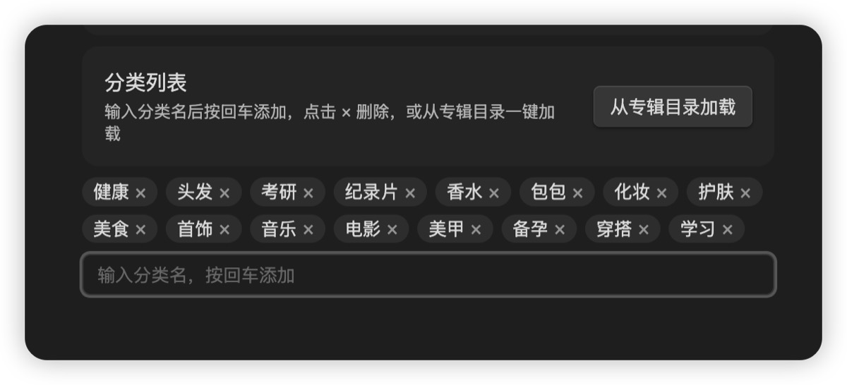 可以手填 JSON 数组,比如 ["旅游", "化妆", "穿搭", "家居", "美食"];也可以点一下「从专辑目录加载」------插件直接把你小红书现有的专辑名拿来用,省得再想。