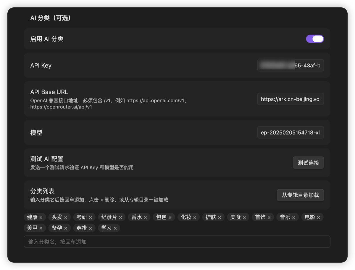 这是最要命的那一块。手动整理 1400 条,按每条 30 秒算需要 11.7 小时;开启 AI 分类之后,你第一次配好 API Key,剩下的事情你再也不用管 ------新同步进来的每一条,插件都会把标题+正文+标签丢给 AI,拿回分类名,然后把文件放进对应的子目录。