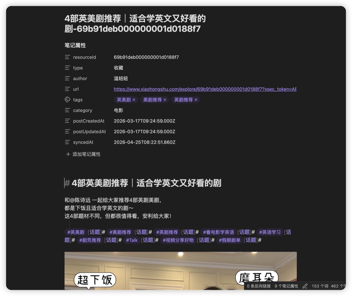 每一条小红书笔记在 Obsidian 里长这样: