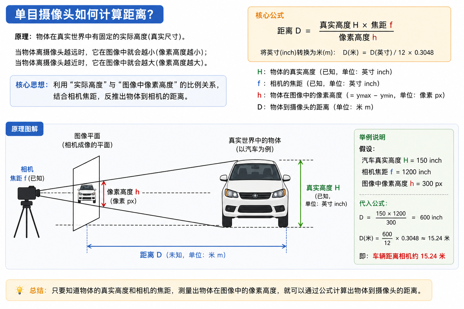 就是这么简单!不过真正用起来还有不少细节要注意。实际上,车辆抖动和相机内参都需要保证绝对稳定,才有单目测距的可用性。
