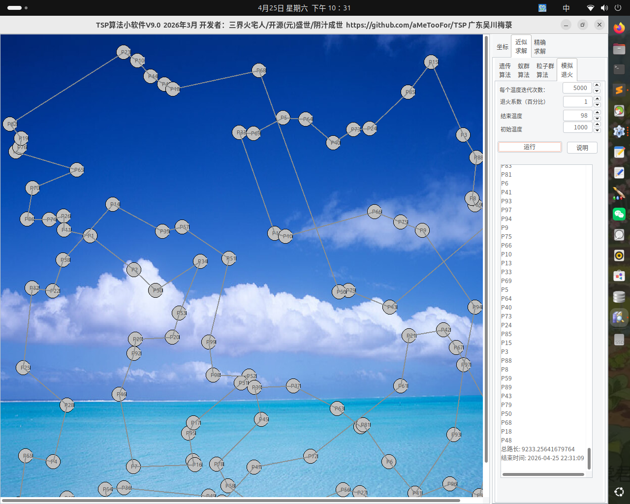 2)当坐标点是随机分布,sealine算法目前自认为确实在100点,到500点,比模拟退火效果要好不少,高于500点时,个人PC电脑硬件问题,不理了。