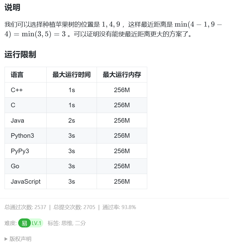 依旧是用二分去逼近最小距离,我们可以看当最小距离是mid时,我们能种多少棵树,mid越大,能种的树越少,能种的树要>=N,所以