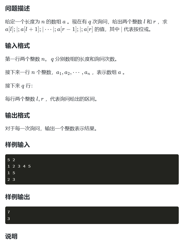 这道题关键是用前缀和思想去做,求a[2] 到 a[3] 之间的 |的结果,那a[1] | a[2] | a[3] 的结果要去除掉 | a[1]的效果,这该怎么搞,,我们可以看a[1] 对结果的贡献, | 是那一位比特位是1,结果的是比特位上就是1,所以我们可以看每一个数字的每一位比特位上是1还是0 ,对每个数字的一个比特位做前缀和,(在检查时只需要看一个比特位上是否大于0 即可),用一个二维数组[32][N] ,前面代表每一个比特位,后面的每一位代表前缀和,这样我们想去掉 | a[1] 的效果就减去a[1] 在每个比特位上的数(1/0),反正减去后如果该比特位上的数依旧大于0, 说明有其他数字在该位上是1 的 ,结果不影响