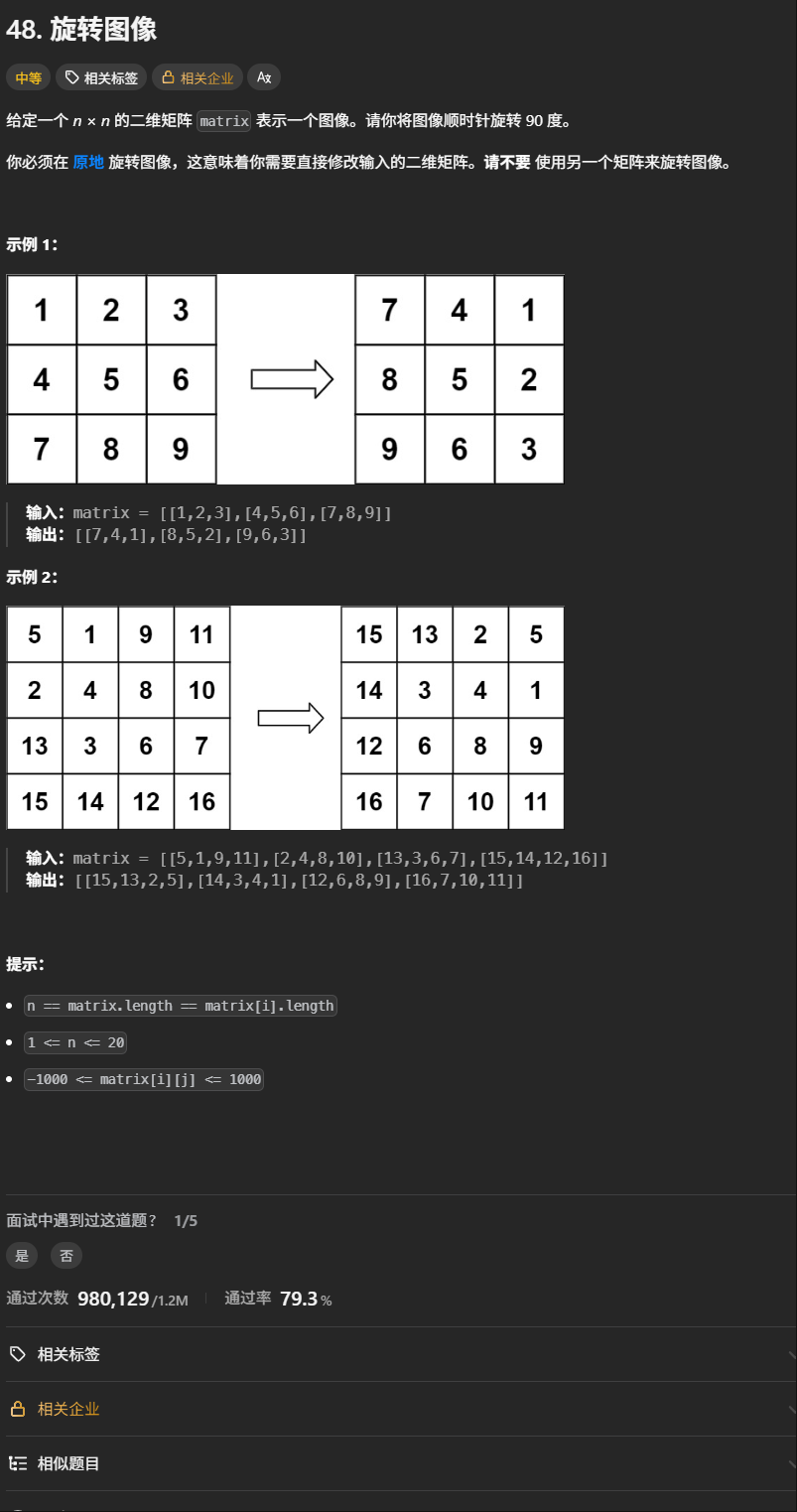 1.核心思想:顺时针旋转90度 = 先上下水平翻转 再沿主对角线翻转。