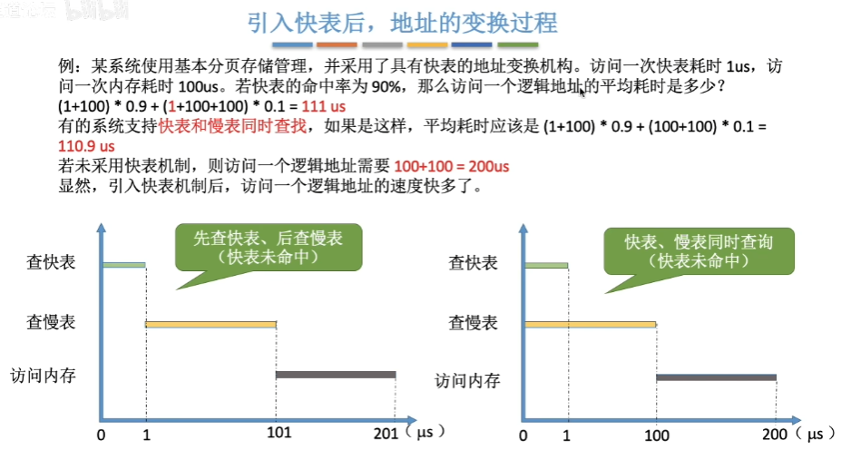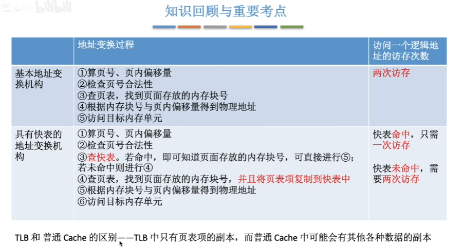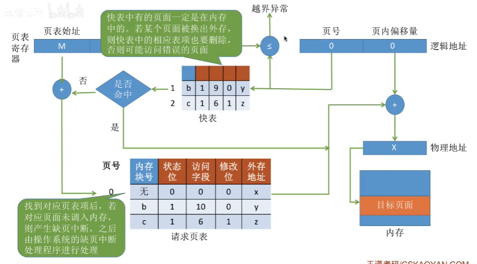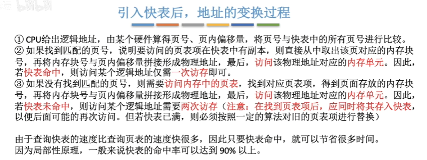 这里再补充一点,在具有快表机构的请求分页系统中,访问一个逻辑地址时,若发生缺页,则地址变换步骤是:查快表(未命中)――查慢表(发现未调入内存)――调页(调入的页面对应的表项会直接加入快表)――查快表(命中)――访问目标内存单元。