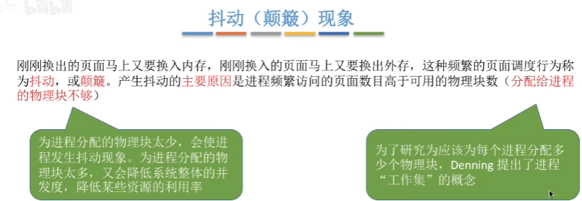 为进程分配的物理块太少,会使进程发生抖动现象。为进程分配的物理块太多,又会降低系统整体的并发度,降低某些资源的利用率。为了研究应该为每个进程分配多少个物理块,提出了进程的"工作集"的概念。